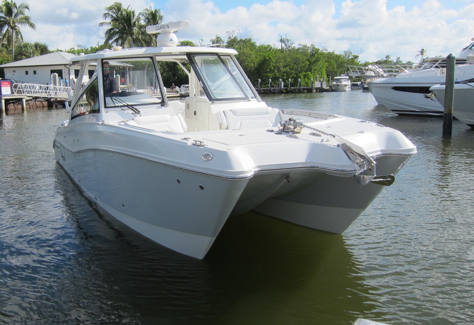 Enjoy a private boat charter on our WorldCat 325DC surrounded by crystal-clear blue waters.